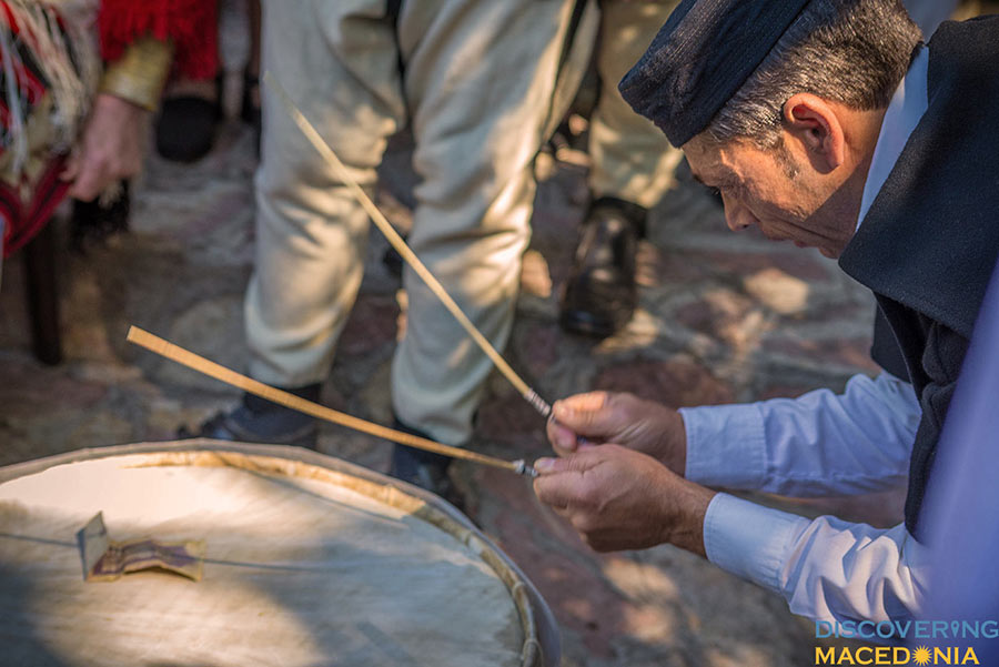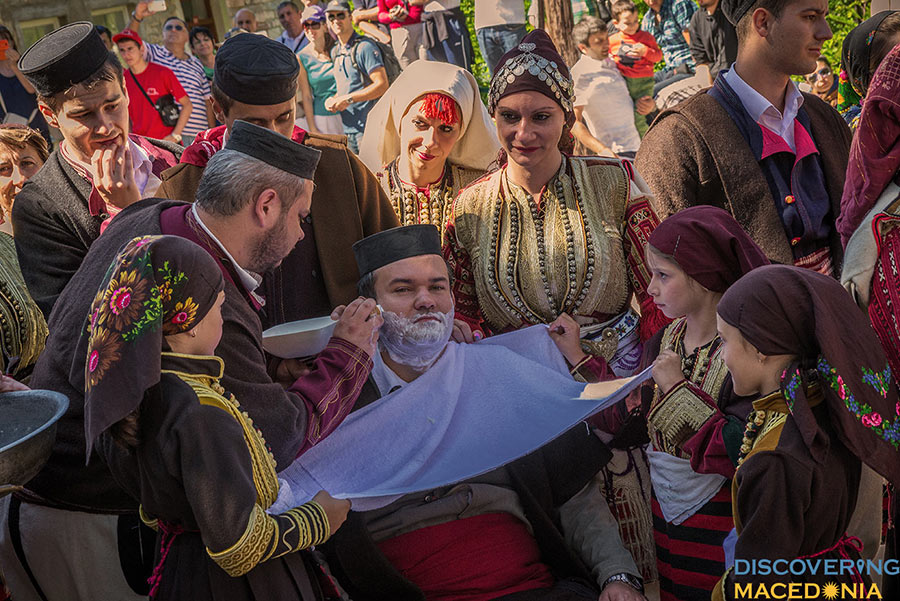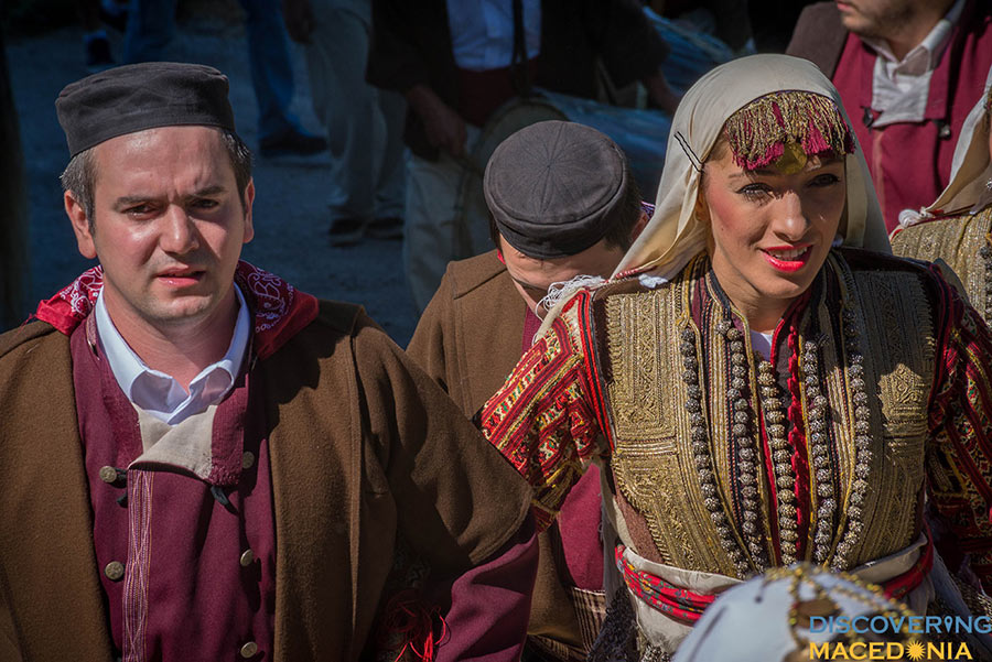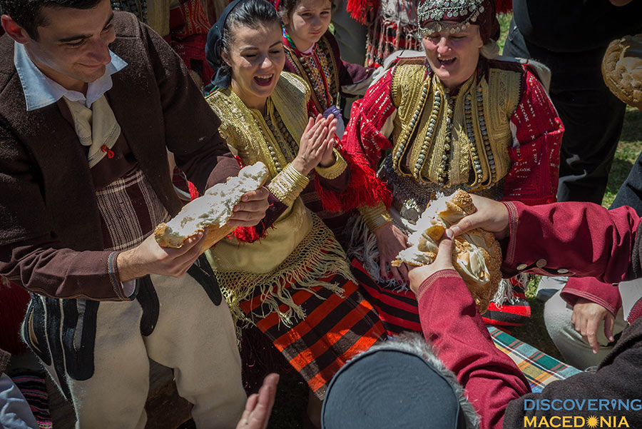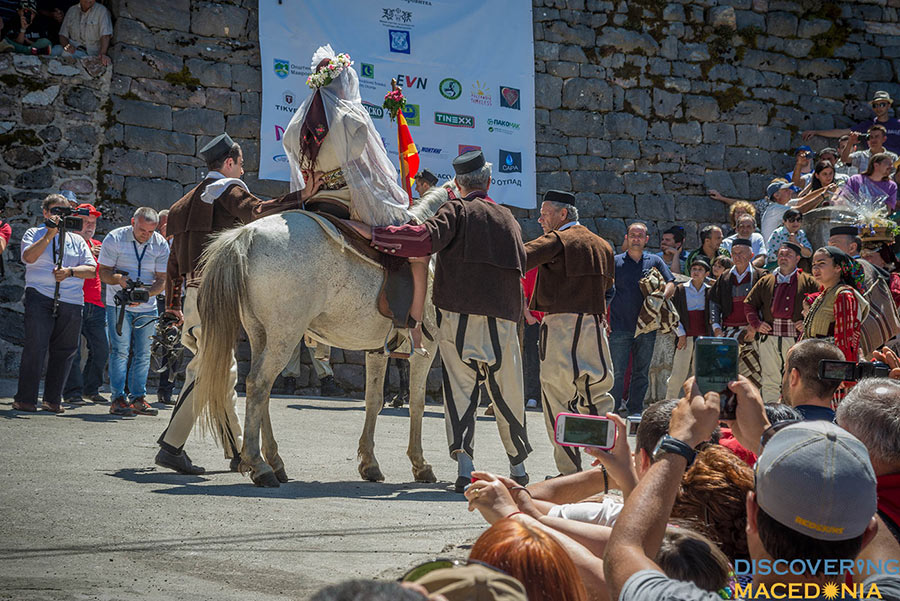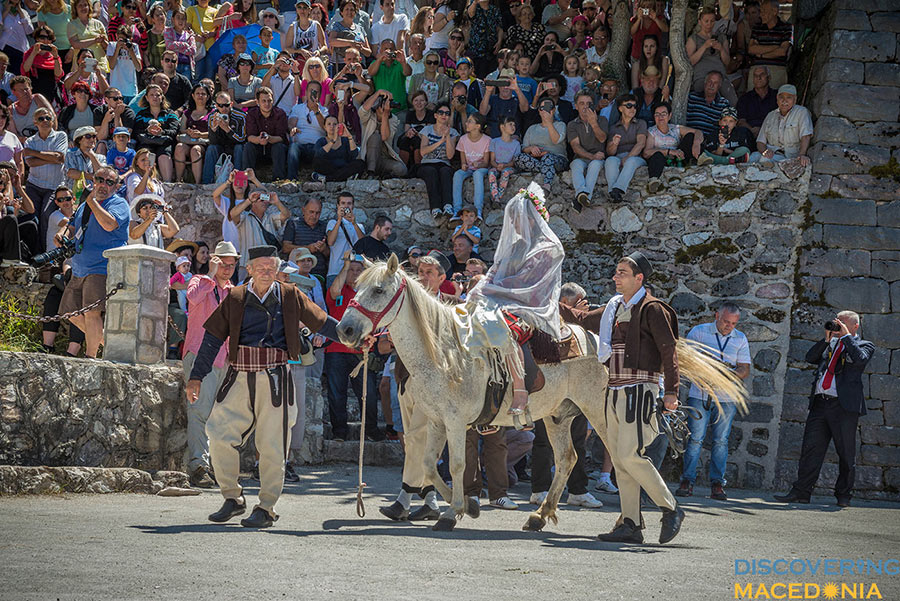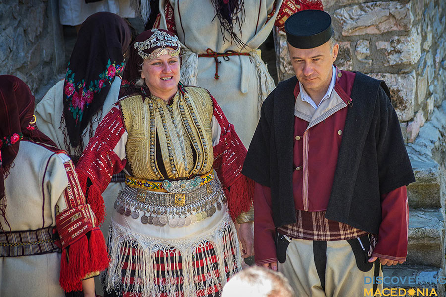 During the wedding, men dance the “Teshkoto”, a shepherd folk dance, one of the national dances of Macedonia, symbolizing the suffering of the Macedonian people through the centuries. Music and dance, having a central role in the event command much attention. In a staccato sequence, an incredibly wide spectrum of folk costumes, embroidery, dance and music take place. Observing even from a distance, the atmosphere dictates a pulsating rhythm that makes hard to keep your feet-on-the-ground attitude.